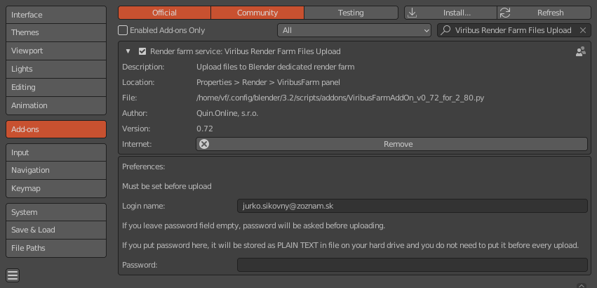 You can also enter a password (which you entered during the registration process) so that you do not have to enter it every time you send a render request. If you enter it (here, in the configuration), it will be stored, in readable form, in a configuration file on your disk (which can be a security risk). If you do not enter it (in the add-on configuration), you will have to enter it before sending a render request every time.