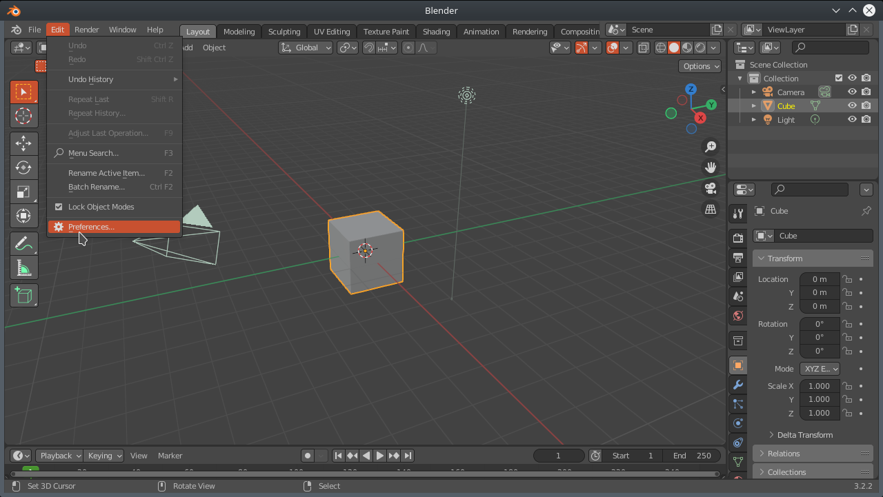 After downloading the add-on, launch Blender. In the menu, select Edit / Preferences: