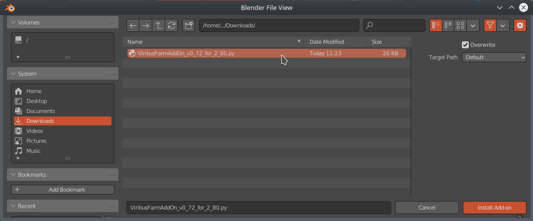 A file search window will open. You need to open the directory where you saved the add-on when you downloaded it. For example, the “Downloads” directory. If you are not sure where your browser saved the add-on when you downloaded it, switch to your browser and open the tab with the overview of downloaded files. Then (in Blender) select the appropriate file (for example, ViribusFarmAddOn_v0_99_2.py)