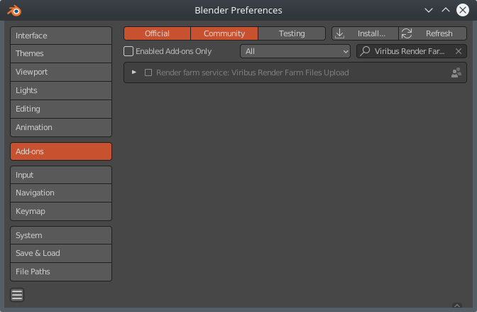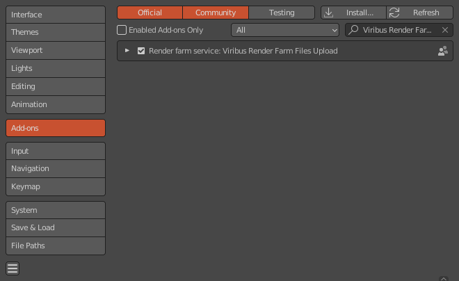 You can get the add-on on the website www.viribusfarm.com. After registering (which is free) and logging in, you can get the add-on in the “To download” section. Since there have been significant changes in Blender version 2.8, we offer the add-on for versions 2.8 and above.: This document contains a description of the add-on only for version 2.8 (and later). If you are interested in the add-on for Blender version 2.79 (or lower), write us a message. You can get the add-on by clicking on the appropriate link (in the “To download” section on www.viribusfarm.com). After clicking on the appropriate link, the download of the add-on will begin. Depending on how your internet browser is set up, it will save the file to the default directory, or you will be offered the option to select a directory. Pay attention to the information where the file will (was) saved, because you will need it in the next step.