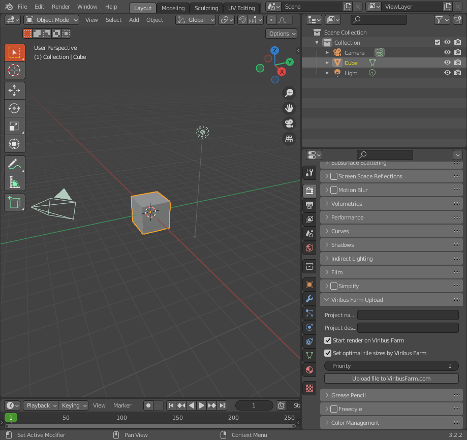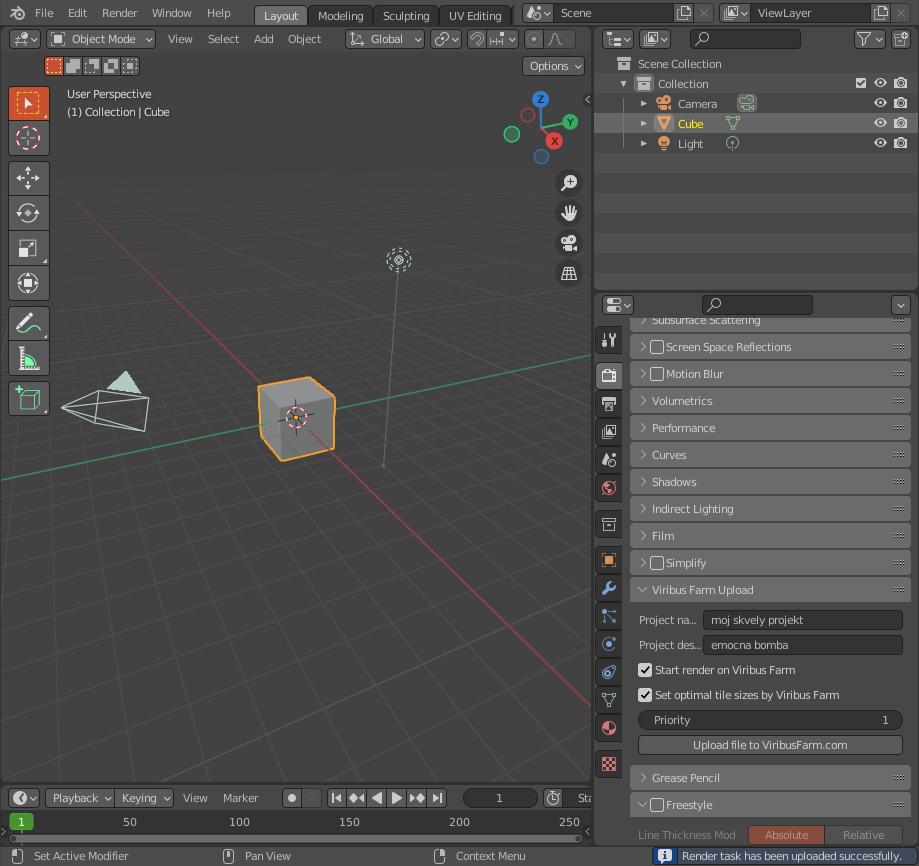 Using the “Viribus Farm Upload” panel, it is possible to submit rendering jobs directly from Blender.